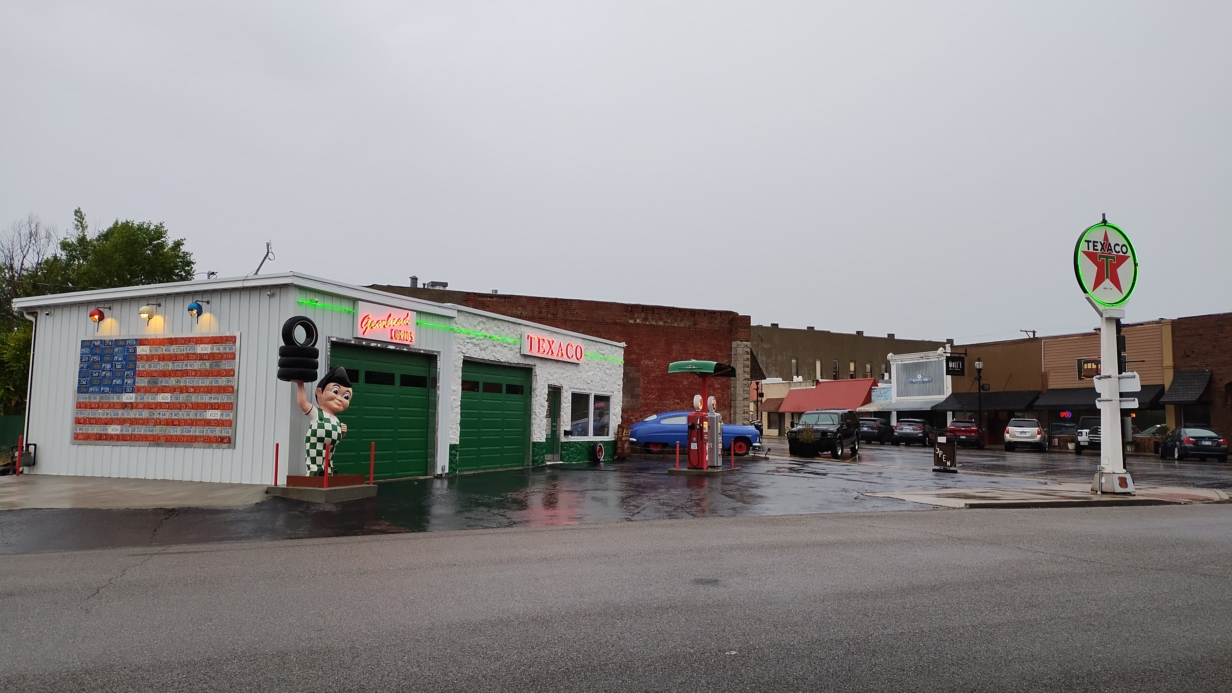 Gearhead Curios is a 1939 Texaco station that was built from native stone. The old station was on Route 66 until June 1st 1963 when a new alignment put the station one block off of Route 66. This station serviced travelers up through the 1980s. A series of odd things for the next 10ish years, then it sat as storage for the next 15 or so years. In Oct 2018 the old building was purchased by the Perry family & became Gearhead Curios, renovations began. As renovation continued it became more of a travel destination. An American Flag made from 169 Kansas license plates known as the Tag Flag greeted travelers in May 2020, the addition of a 1951 Hudson, a tribute to the character Doc joined Gearhead Curios in Aug 2020. Vintage pumps & neon were installed in 2021. In 2022 Gearhead Curios opened full time while renovations were still being competed. June 2023 saw the official ribbon cutting. The inside is full of unique memories & boasts the most photographed restroom on Route 66.